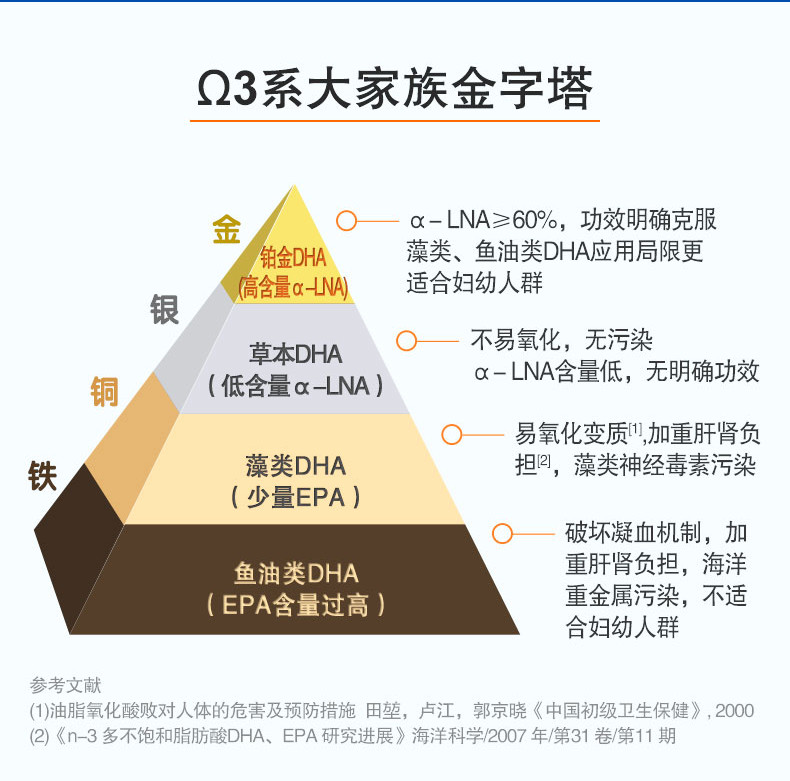 Omega-3包括α-亚麻酸(α-LNA) 、EPA和DHA,其中α-LNA来源于纯天然植物中提取并提纯而成,相对于来源于海洋动植物组织(海洋鱼油或藻类制品)中的EPA和DHA—“海洋动植物源性Ω3”,α-LNA也被称为植物源性Ω3。